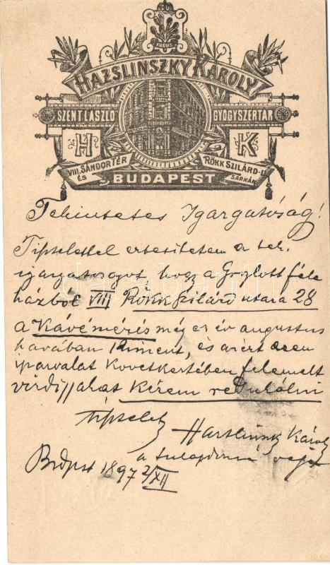 1897 Budapest VIII. Hazslinszky Károly "Szent László" gyógyszertára; Sándor tér és Rökk Szilárd utca sarkán, a tulajdonos által írt üzenettel (EB)