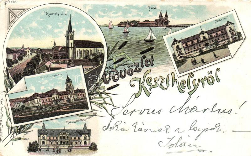 1899 Keszthely, Festetics kastély, fürdő, Balaton és Hullám szálló, Mérei Ignác No. 587. Art Nouveau, litho (Rb)
