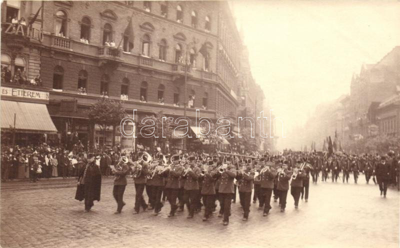 1914 Budapest VIII. Baross tér, katonazenekar, katonai parádé, Skultét...
