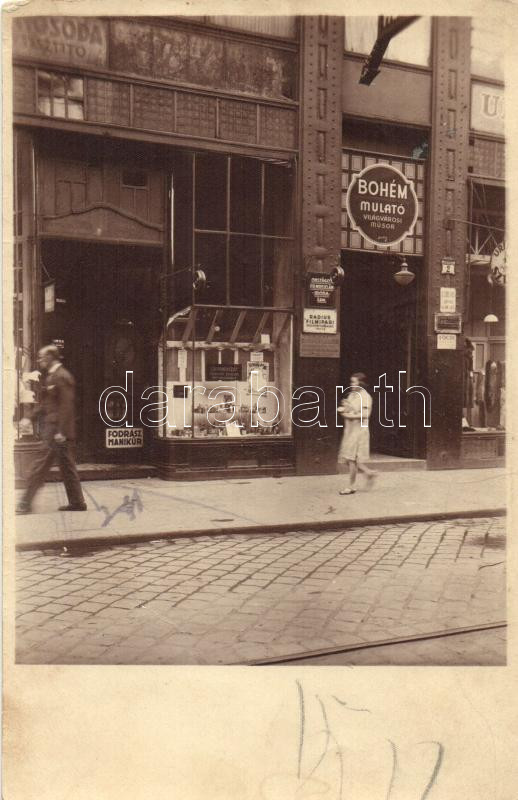 Description: 1930 Budapest VII. Klauzál utca 2.; Bohém Mulató, Radius Filmipari Rt., A Fonciere biztosító, fodrász és manikűr, Országos Filmreklám iroda, Úri fogászat, photo