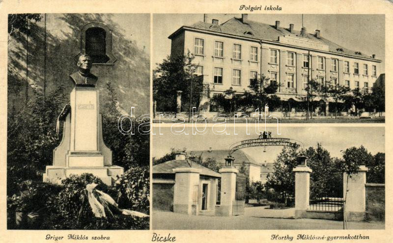 Bicske, Griger Miklós szobra, Horthy Miklósné gyermekotthon, Polgári iskola (EB)