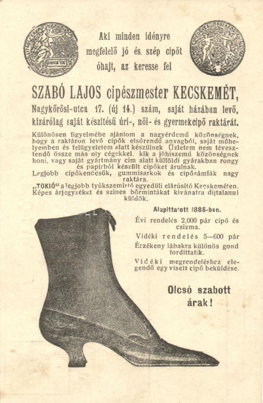 Kecskemét, Szabó Lajos cipészmester reklám képeslapja / Hungarian shoemaker's advertising postcard