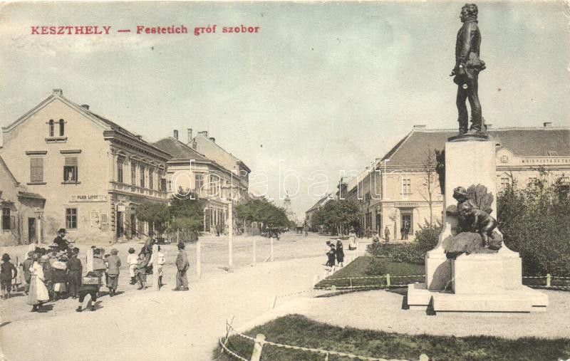 Keszthely, Festetich gróf szobor, Pler Lipót üzlete, gyógszertár. S. D...