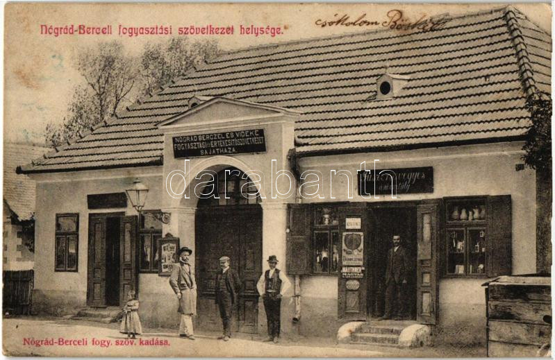 Description: Nógrádbercel, a Nógrádbercel és Vidéke Fogyasztási és Értékesítőszövetkezet üzlethelyisége; a fogyasztási szövetkezet kiadása (ragasztónyom / gluemark)