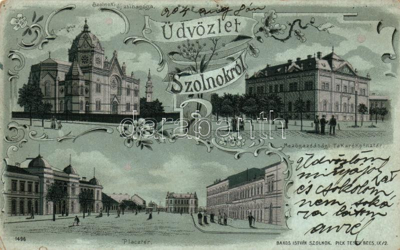 Szolnok, Új zsinagóga, Mezőgazdasági Takarékpénztár, Piac tér, kiadja Bakos István, floral, litho (EK)