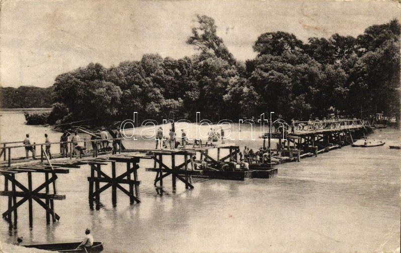 Description: Első világháborús katonák pontoon híd építése közben, kiadja Tolnay András / WWI Hungarian soldiers during a pontoon bridge construction (ázott / wet damage)
