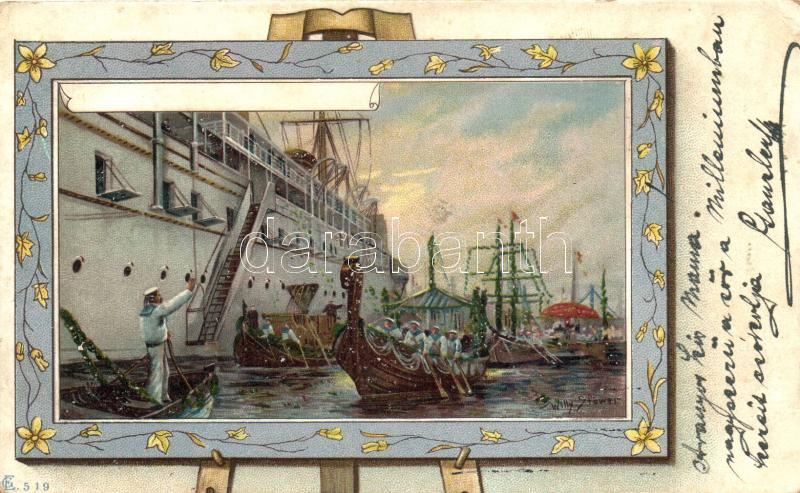 Passenger steamship with mariners, floral, litho s: Willy Stower (EK)