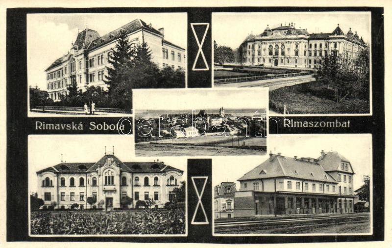 Description: Rimaszombat, Rimavská Sobota; vasútállomás, Gömör és Kishont vármegyeháza, Egyesült protestáns főgimnázium, gyermekmenhely / railway station, county hall, grammar school, children's home