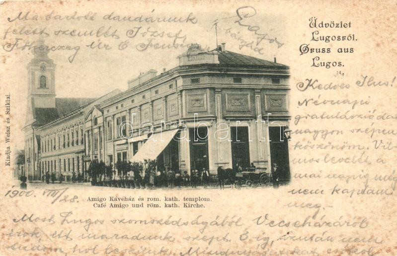 Lugos, Lugoj; Amigó kávéház és Római katolikus templom, kiadja Weisz é...