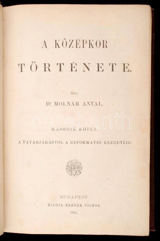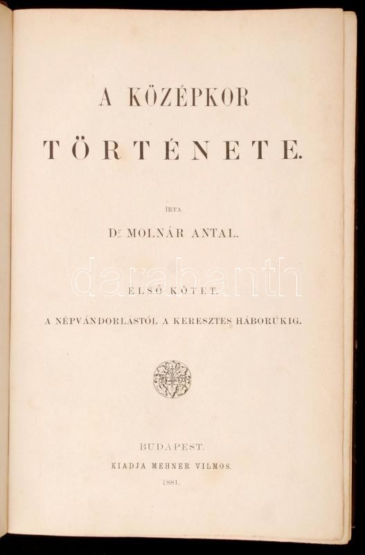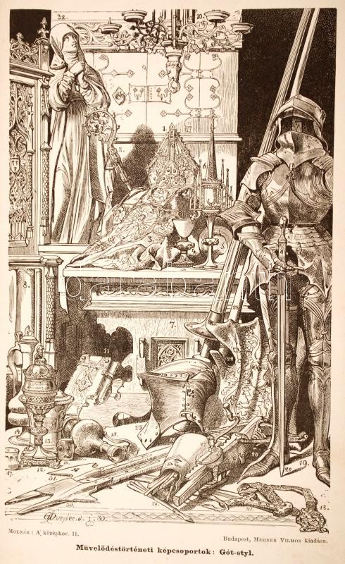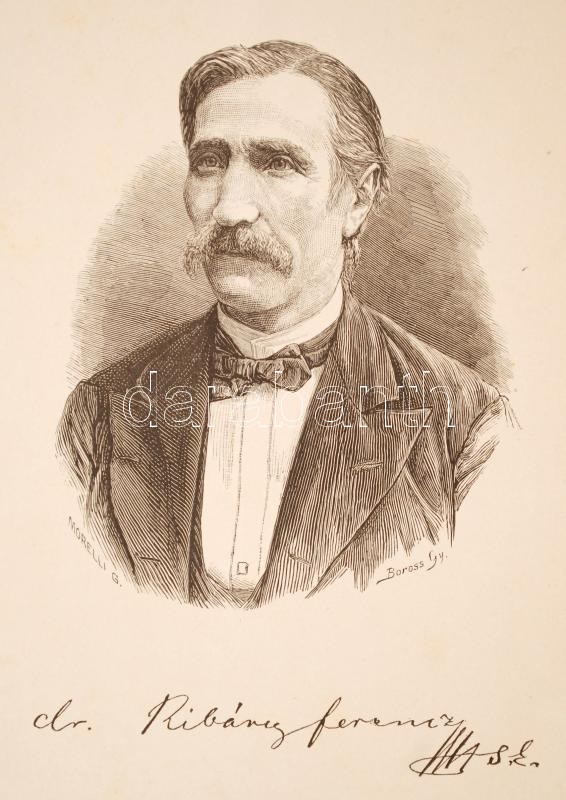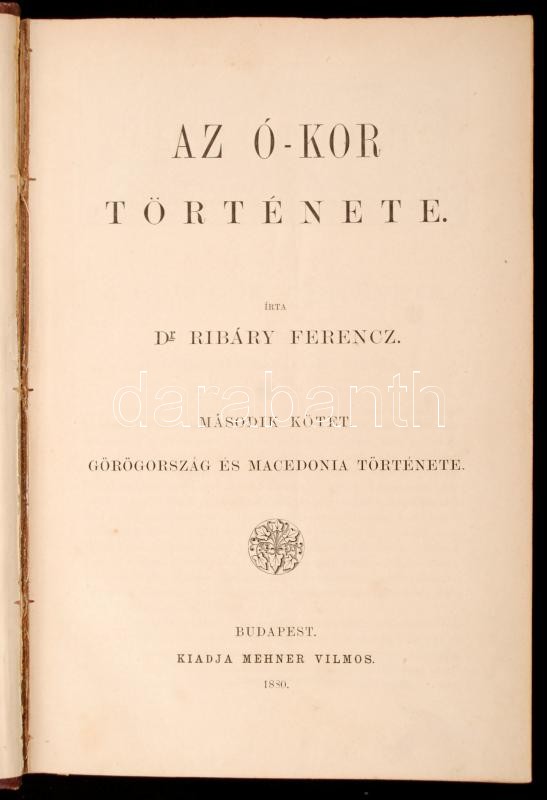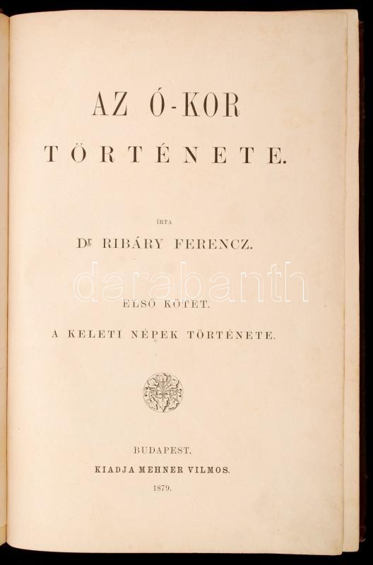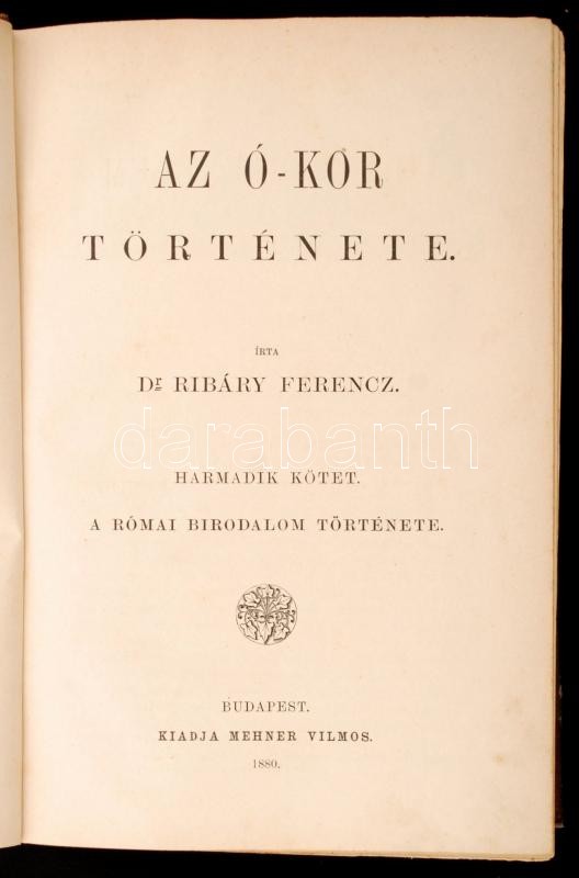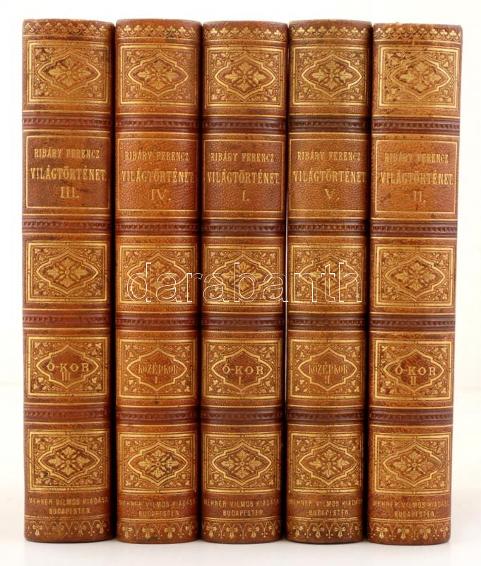 Ribáry Ferenc: Világtörténelem a mívelt magyar közönség számára. Földabroszokkal, arcz és mívelődéstörténeti képekkel díszítve. I-V. kötet. I-III. kötet: Az ó-kor története. IV-V. kötet: A középkor története. Bp., 1879-1882. Méhner Vilmos. Mindegyik kötetben rendkívül gazdag egészoldalas és szövegközti képanyaggal. Egységes, díszesen aranyozott, bordázott gerincű félbőr kötésben.