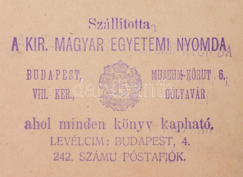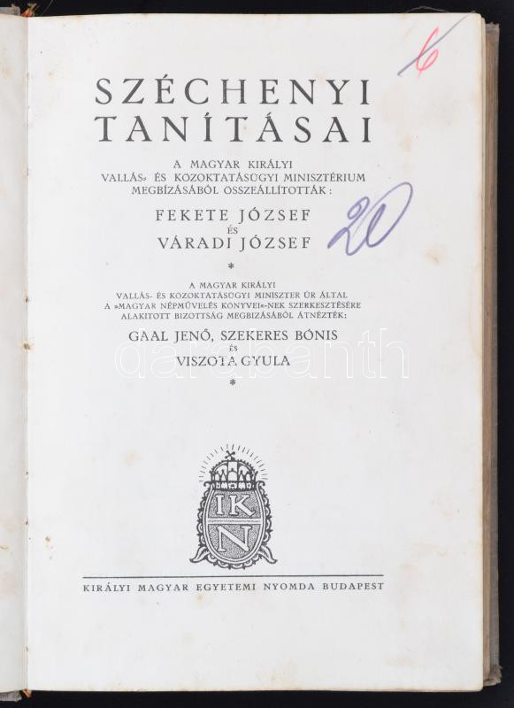 Description: Széchenyi tanításai. Összeállította Fekete József, Váradi József. Bp., 1926, Kir. Magy. Egyetemi Ny. 325 p, (A Magyar Népművelés Könyvei) Kiadói kopottas, illusztrált vászonkötésben, az Egyetemi Nyomda szállítói pecsétjével.