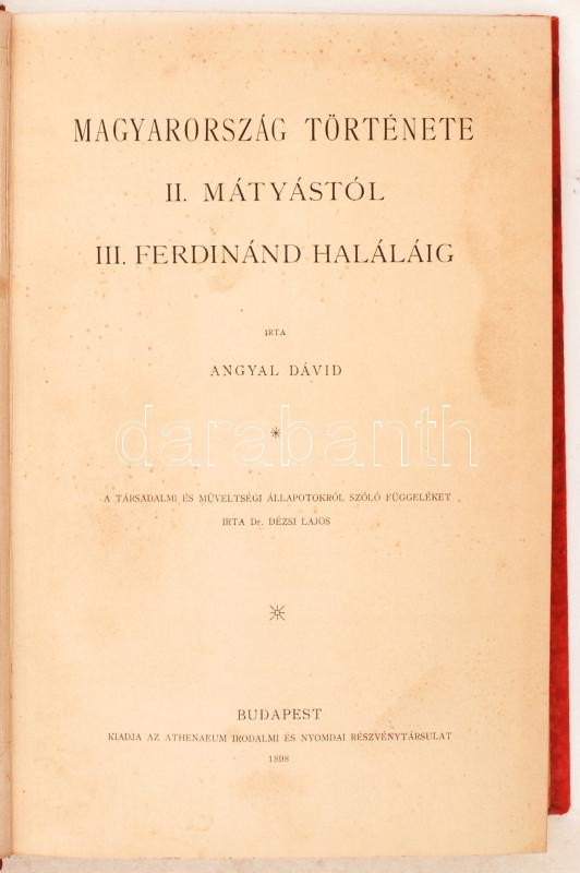 Hatodik kötet. Magyarország története II. Mátyástól III. Ferdinánd haláláig. Írta Angyal Dávid. Budapest, 1898, Athenaeum. Díszes, aranyozott, kiadói félbőr kötésben. Gerinc kissé javításra szorul, a hátoldal elszíneződött, egyébként jó állapotban.