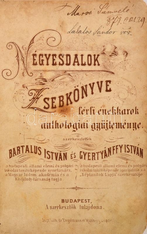 Description: Bartalus István Gyertyánffy István (szerk.): Négyesdalok zsebkönyve. Férfi énekkarok anthologiai gyűjteménye. Budapest,(1887, Engelmann et Mülberg.Félvászon kötésben, közepes állapotban.