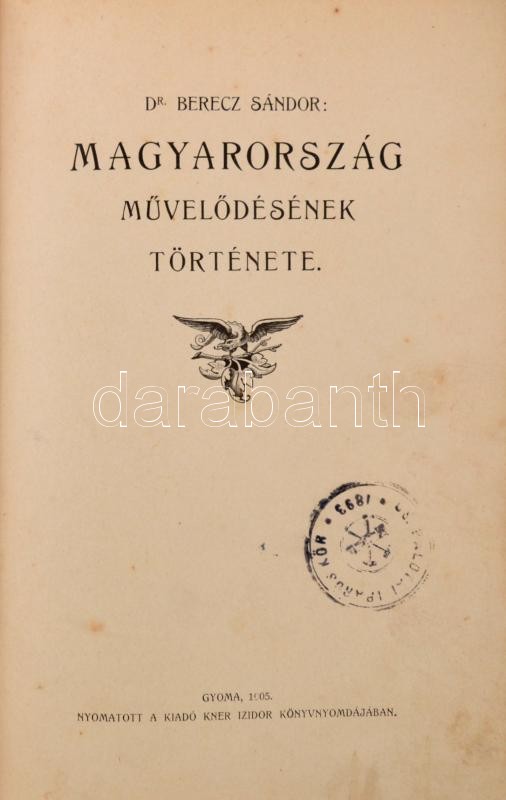 https://www.darabanth.com/en/262-Online-auction/262.0/Books/Books-Other-rarities~45/Berecz-Sandor-dr-Magyarorszag-muvelodesenek-tortenete-Gyoma-1905-Kner-Izidor-Kiadoi-~II980180