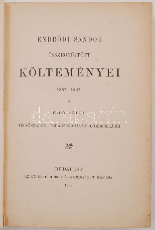 https://www.darabanth.com/en/262-Online-auction/262.0/Books/Books-Other-rarities~45/Endrodi-Sandor-osszegyujtott-koltemenyei-1867-1897-1-kot-Tucsokdalok--viragfakadast~II1053739
