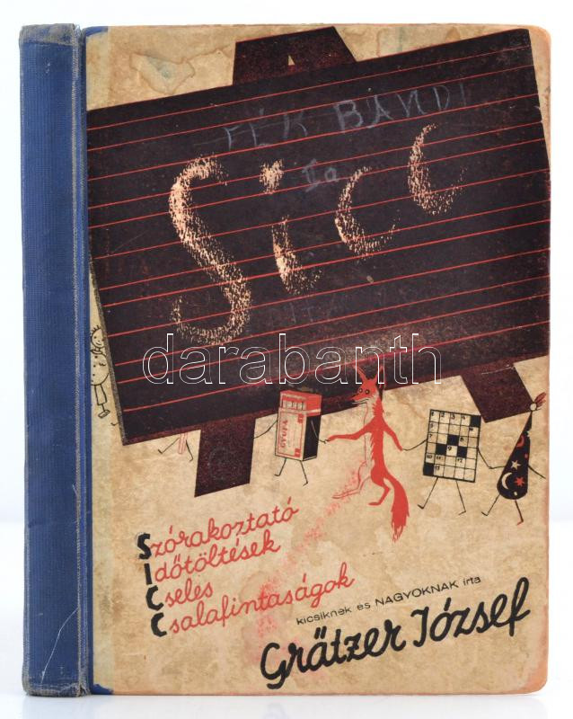 Grätzer József: Sicc. Szórakoztató Időtöltések Cseles Csalafintaságok. Hauswirth Magda rajzaival. Ötödik kiadás. Bp., 1937, Színházi Élet. (Athenaeum ny.) 112 p. Szövegközti ábrákkal. Néhány rejtvény kitöltve, kiszínezve.. Kiadói kopottas, kissé merev tartású félvászonkötésben.