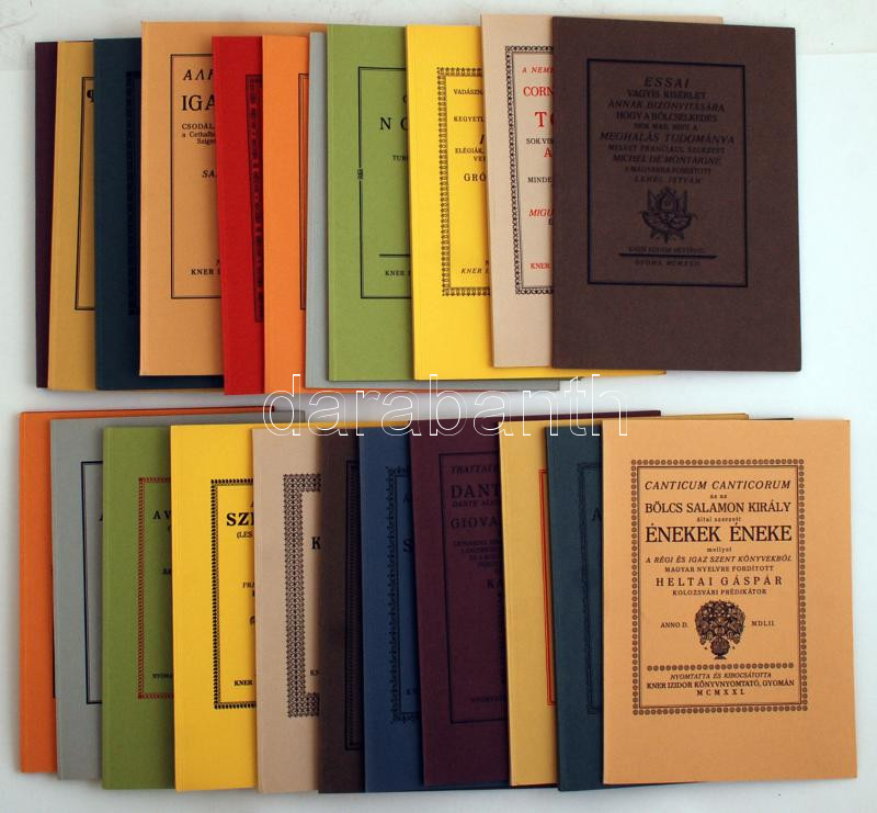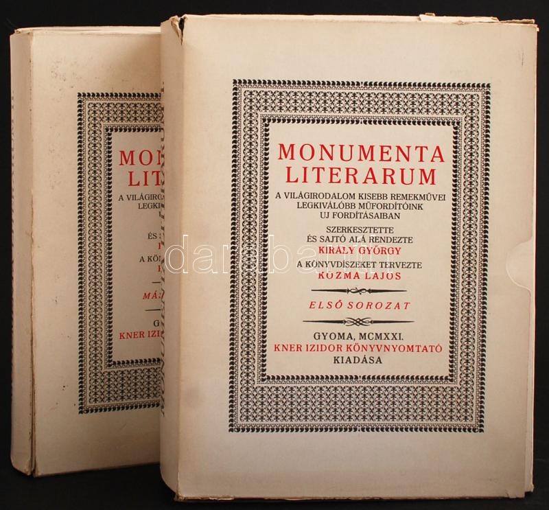 Description: Monumenta literarum. (A világirodalom kisebb remekművei. Kner hasonmás kiadás A könyvdíszeket tervezte Kozma Lajos.) 1.-2. sorozat. Komplett! összesen 24 db Kner Izidor, Gyoma (a tékákon kisebb hibák, de a tatalom szép állapotban)