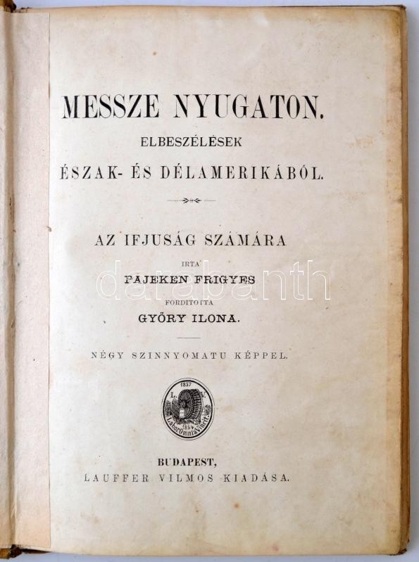 Pajeken Frigyes: Messze Nyugaton. Elbeszélések Észak- és Délamerikából. Négy szÃnnyomatú képpel. Bp., é.n., Lauffer Vilmos kiadása. Kiadói viseletes, elszÃnezÅ‘dött, sérült egészvászon-kötésben. Belül jó állapotban.