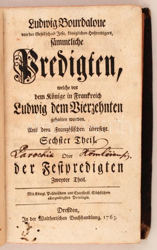 Sämmtliche Predigten, welche vor dem Könige in Frankreich Ludwig XIV., sind gehalten worden: Aus dem Französischen übersetzt. Theil 6. Dresden, 1763, Walther. 553 p. Korabeli, sérült-hiányos bőrkötésben.