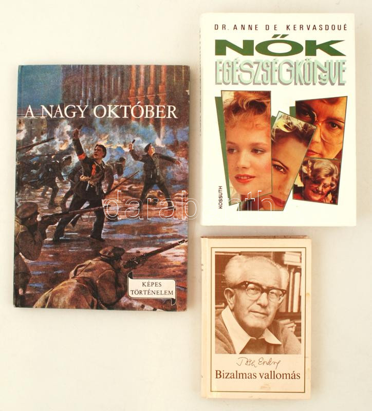 Description: Tóth Endre: Bizalmas vallomás. Bp., 1984, Magvető. valamint Képes Történelem: A nagy október. Bp., 1967, Móra; és Dr. Anne de Kervasodoué: Nők egészségkönyve. Bp., Kossuth, 1992. Kiadói keménykötésben mindhárom.