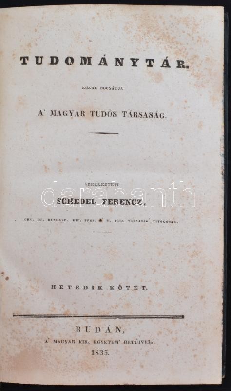 Description: Tudománytár: Közre bocsátja a' Magyar Tudós Társaság. Szerk. Schedel Ferencz. Hetedik kötet. Budán, 1835. M. Kir. Egyetem betűivel. 274 p.