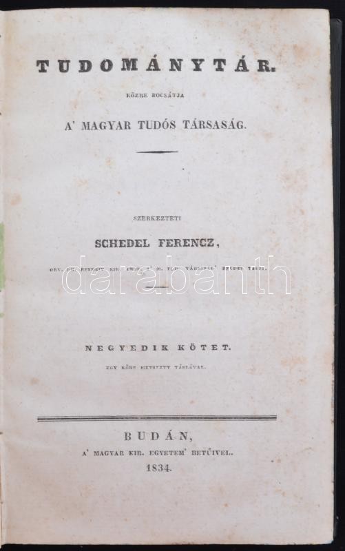 Description: Tudománytár: Közre bocsátja a' Magyar Tudós Társaság. Szerk. Schedel Ferencz. Negyedik kötet. Budán, 1834. M. Kir. Egyetem betűivel. 276 p.