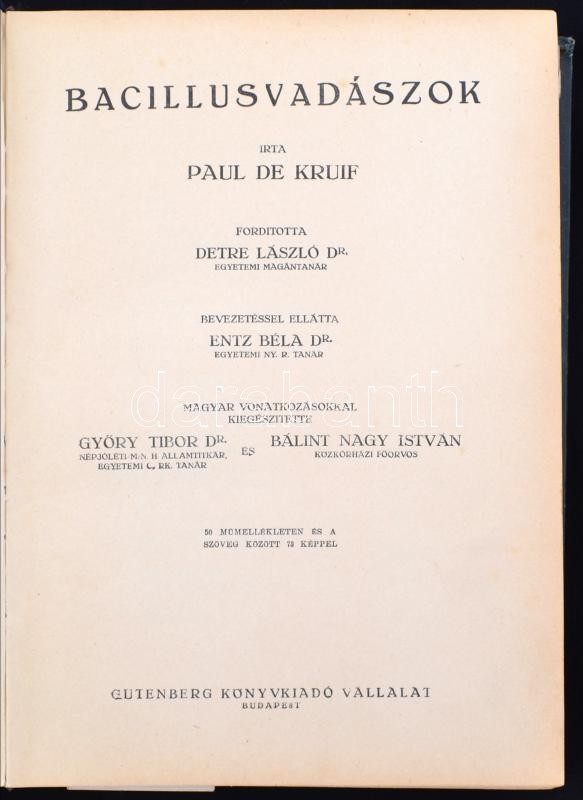 De Kruif: Bacillusvadászok. Ford.: Detre László. Bev.: Entz Béla. Magy... https://www.darabanth.com/en/262-Online-auction/262.0/Books/Books-Science-and-technology~35/De-Kruif-Bacillusvadaszok-Ford-Detre-Laszlo-Bev-Entz-Bela-Magyar-vonatkozasokkal-kiege~II1286742