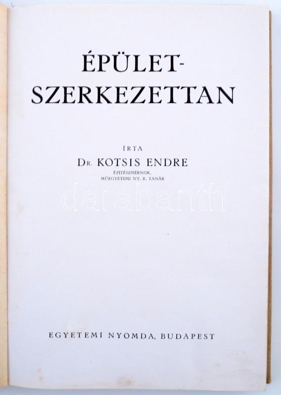 Bp., é.n., Egyetemi Ny. 376 p. ... https://www.darabanth.com/en/262-Online-auction/262.0/Books/Books-Science-and-technology~35/Dr-Kotsis-Endre-Epuletszerkezettan--Bp-en-Egyetemi-Ny-376-p-Szamos-szovegkozti-es-e~II1260506
