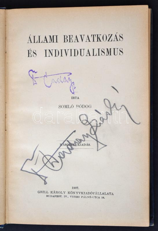 Somló Bódog: Állami beavatkozás és individualizmus. Bp., 1907, Grill K. Kiadói kopottas egészvászon-kötésben. Tulajdonosi bejegyzéssel, pecséttel.