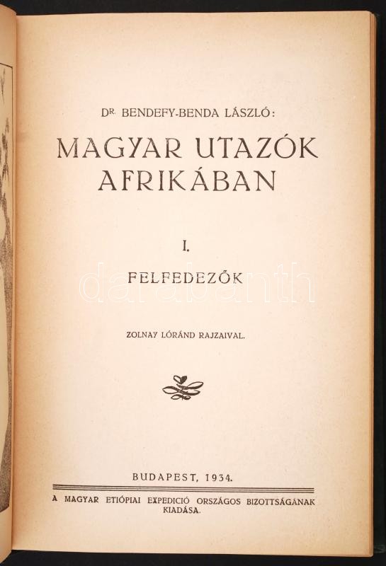 Bendefy-Benda László: Magyar utazók Afrikában I. Bp., 1934. Magyar Etióp Expedíció kiadása. Kiadói aranyozott egészvászon-kötésben, jó állapotban.