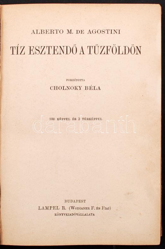 De Agostini, Alberto M.: Tíz esztendő a Tűzföldön. Bp., é. n., Lampel R. Kopott vászonkötésben, egyébként jó állapotban.