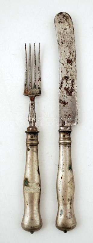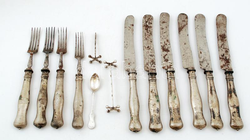 Ezüst(Ag) nyelű 6 db kés, 4 db villa, bruttó: 852 g, kiskanál, 2 db késbak(egyik sérült), nettó: 62,7 g, jelzettek