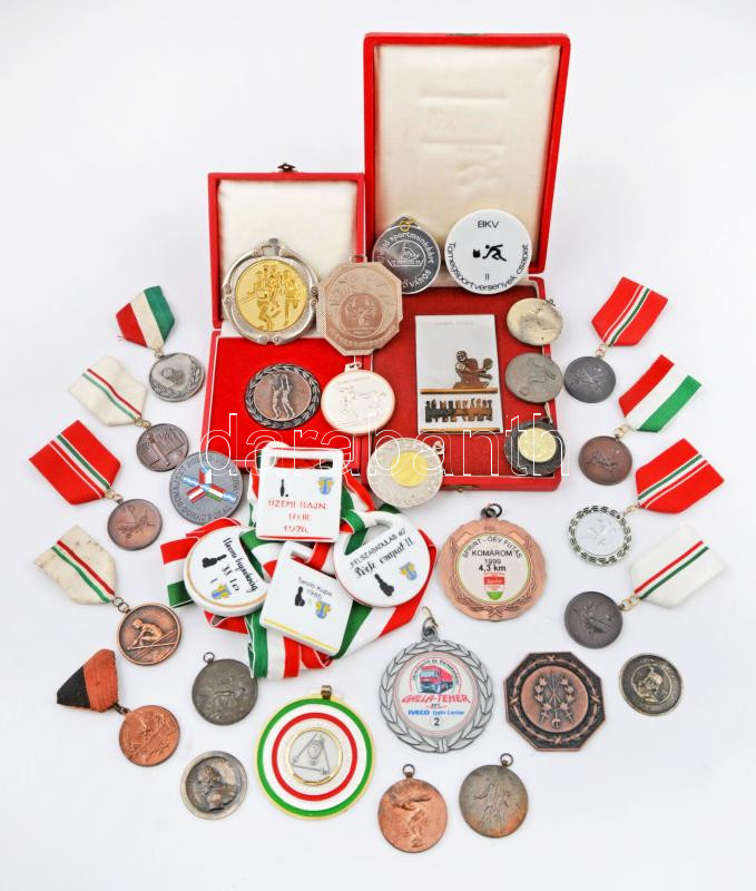 Description: 34db vegyes, főleg szocialista sportérem és -plakett, közte 1954. "Jó munkáért BTSB (Budapesti Testnevelési és Sport Bizottság) 1954" fém plakett eredeti tokban (97x57mm) T:vegyes