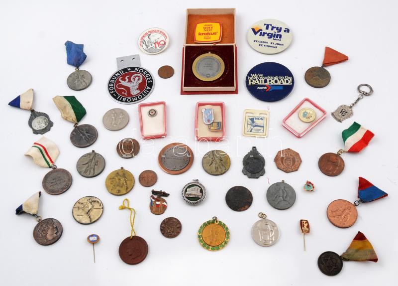 Description: 40db-os vegyes magyar és külföldi falerisztika tétel, benne több sportérem, közte "Fővárosi Nevelőotthoni Törzsgárda 25 év" zománcozott fém jelvény, "Magyar Athletikai Club 1875" Br emlékérem T:vegyes