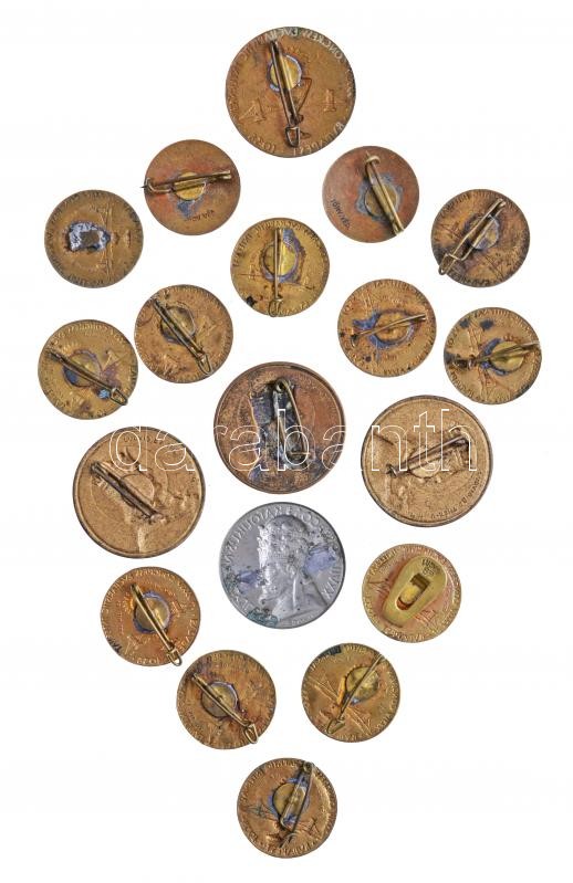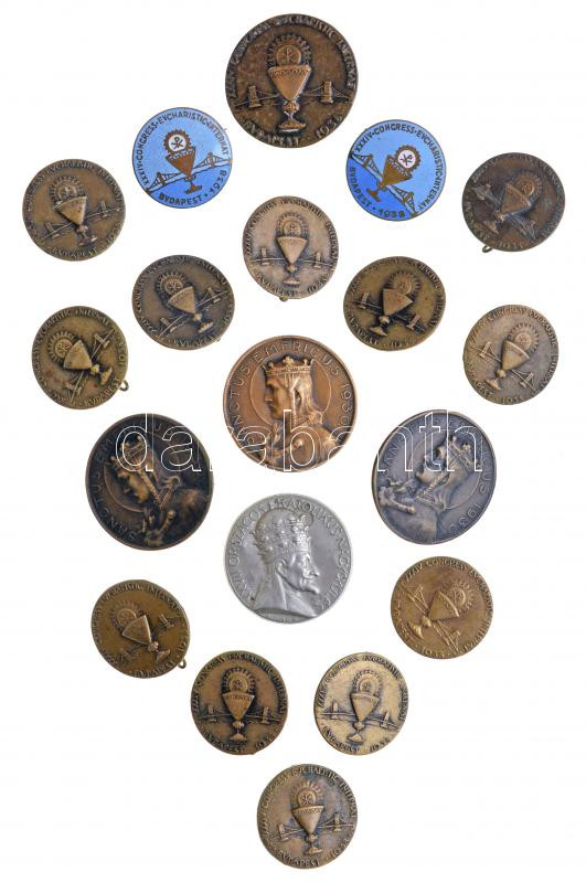 Madarassy Walter (1909-1994) 1938. "XXXIV. Nemzetközi Eucharisztikus Kongresszus Budapest" (13x) Br jelvény + "XXXIV. Nemzetközi Eucharisztikus Kongresszus Budapest" (2x) zománcozott Br jelvény + Zsákodi Csiszér János (1883-1953) 1930. "Sanctus Emericus" Br jelvény "LUDVIG BP THÉK U. 44." gyártói jelzéssel (3x) + Pankotai Farkas Béla (1885-1945) 1936. "XXVII. Országos Katolikus Nagygyűlés - XI. Ince" ezüstözött Cu lemez jelvény (29mm) T:vegyes, 2db jelvényről tű hiányzik