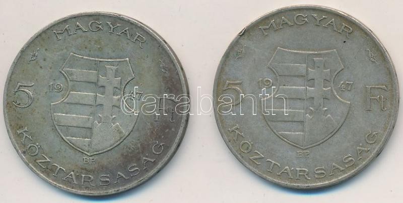 https://www.darabanth.com/en/262-Online-auction/262.0/Numismatics/Hungarian-coins-and-coins-with-Hungarian-mint-marks~200009/1947-5Ft-Ag-Kossuth-2x-T2-3~II1304399