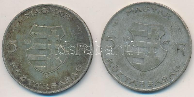 https://www.darabanth.com/en/262-Online-auction/262.0/Numismatics/Hungarian-coins-and-coins-with-Hungarian-mint-marks~200009/1947-5Ft-Ag-Kossuth-2x-T2-3~II1304404