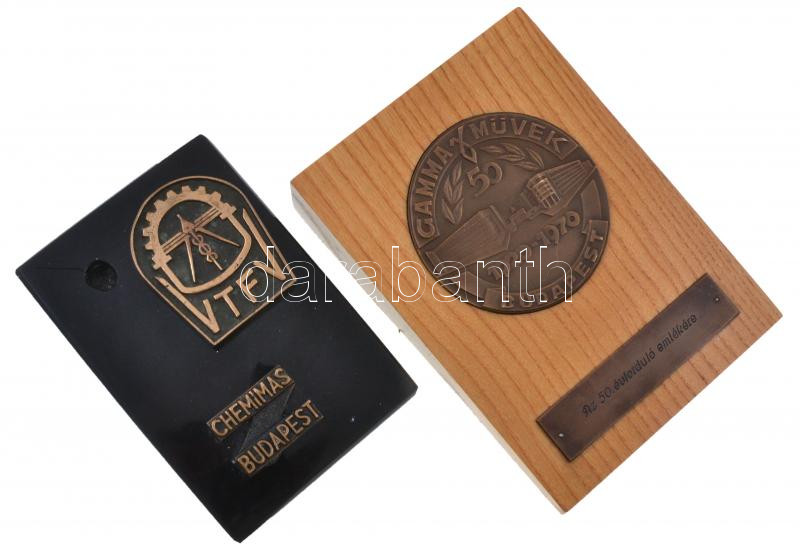 Description: 1970. "50 éves a Gamma művek / Az 50. évforduló emlékére" Br plakett fatalpon (70mm) + "Chemimas Budapest VTFV" Br plakett műanyag talpon (119x83mm) T:2