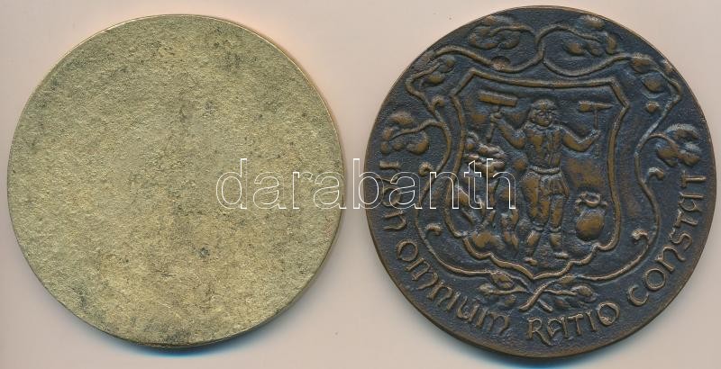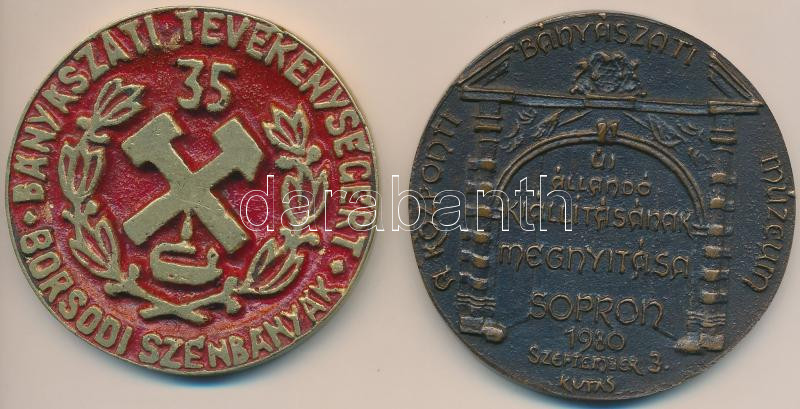 Description: 1980. "A Központi Bányászait Múzeum új állandó kiállításának megnyitása Sopron" Br emlékplakett (81mm) + DN "Bányászati Tevékenységért - Borsodi Szénbányák 35 év" festett fém emlékplakett (77mm) T:2-