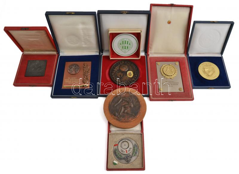 Description: 8db-os emlékérem és plakett tétel magyar labdarúgás témában, egy kivételével mind tokban, közte ~1961. "60 éves a Magyar Labdarúgók Szövetsége" Zn plakett dísztokban (63x63mm), 1988. "MTK-VM Sportklub / 100 éves" fém emlékérem dísztokban (70mm) T:vegyes