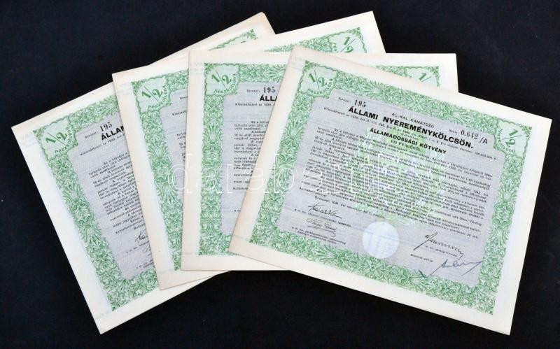 1941. "4%-kal kamatozó állami nyereménykölcsön" államadóssági kötvény 100P-ről (4x) mind szelvényekkel, szárazpecséttel, közte 3db sorszámkövető T:I,I-