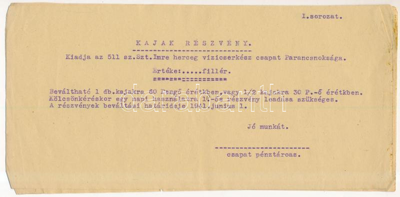 1941. "Kajak részvény" 4db kitöltetlen részvény, kiadta a "Szent Imre herceg vizicserkész csapat Parancsnoksága" T:II,II-