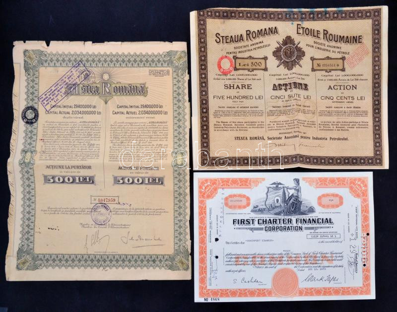 Amerikai Egyesült Államok / Kalifornia 1973. "First Charter Financial Corporation" részvénye bélyegzésekkel, perforációval + Románia / Bukarest 1927. "Steaua Romana Kőolajipari Részvénytársaság" részvénye 500L-ről szelvényekkel, bélyegzésekkel + ~1930. "Astra Romana Részvénytársaság" részvénye 500L-ről bélyegzésekkel T:III