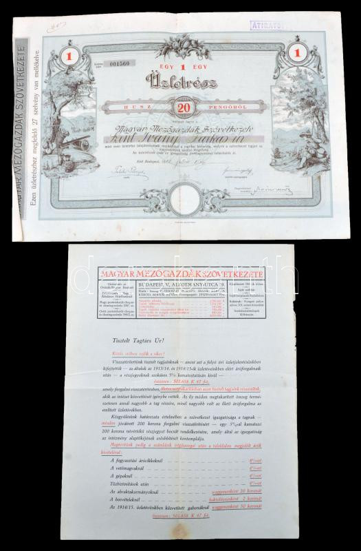 Description: Budapest 1935. "A Magyar Mezőgazdák Szövetkezete" 1 üzletrésze 20P-ről felülbélyegzéssel, szelvényekkel, 1915-ös levéllel a tagtársaknak kiosztott részjegyekről T:II-