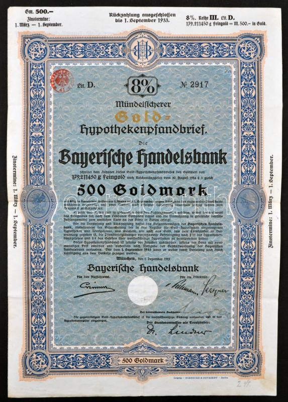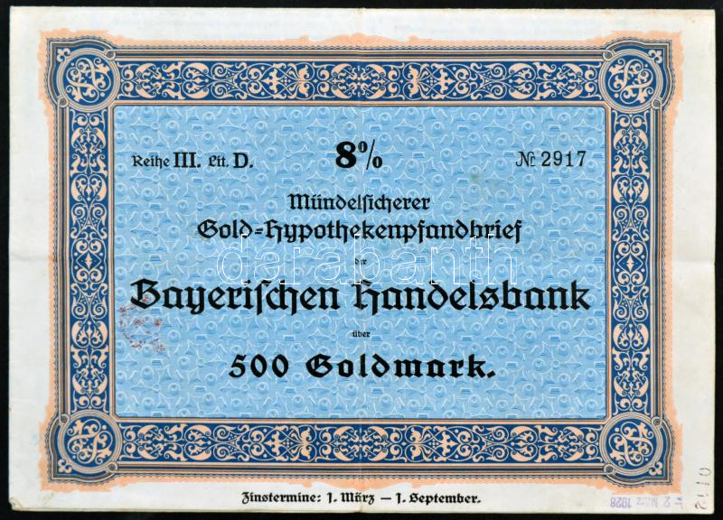 Németország / Weimari Köztársaság / München 1927. "Bajor Keresked... https://www.darabanth.com/en/262-Online-auction/262.0/Numismatics/Shares-and-Tickets~200006/Nemetorszag-Weimari-Koztarsasag-Munchen-1927-Bajor-Kereskedelmi-Bank-arany-jelzaloglev~II1252722