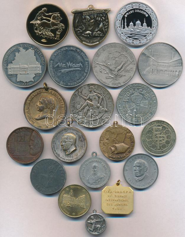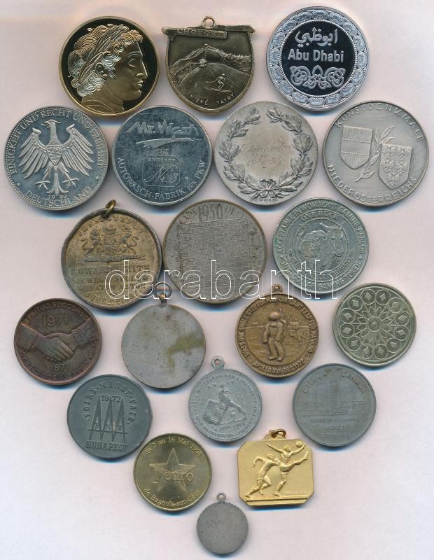 Description: 20db vegyes külföldi emlékérem, medál, közte Egyesült Arab Emírségek DN "Abu Dhabi" fém emlékérem (39mm) T:vegyes