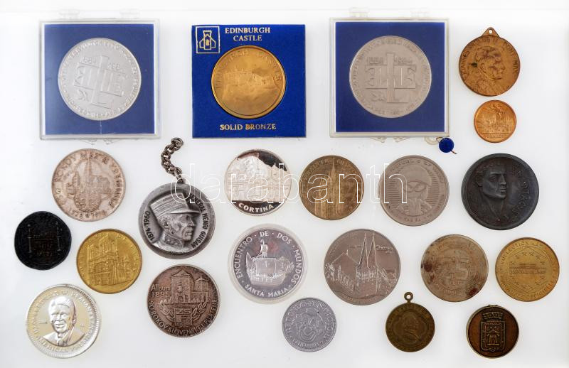 22db-os vegyes külföldi emlékérem és zseton tétel, néhány magyar darabbal, közte Svájc DN "General Henri Guisan 1874-1960" ezüstözött fém emlékérem. Szign.: Huguenin (40mm); Nagy-Britannia DN "Edinburgh vár" Br emlékérem plasztiktokban (37mm) T:vegyes 22pcs of various commemorative medals and tokens, including Switzerland ND "General Henri Guisan 1874-1960" silver plated metal medal. Sign.: Huguenin (40mm); Great Britain ND "Edinburgh castle" Br commemorative medal in plastic case (37mm) C:mixed