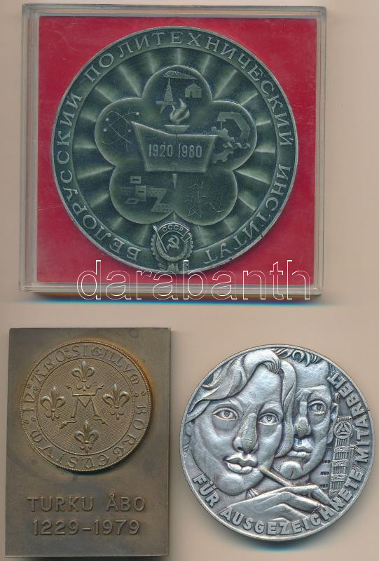Description: 3db-os külföldi érem és plakett tétel, benne "Turku abo 1979", "Für Ausgezeichnete Mitarbeit" T:1-,2 egyiken rep.