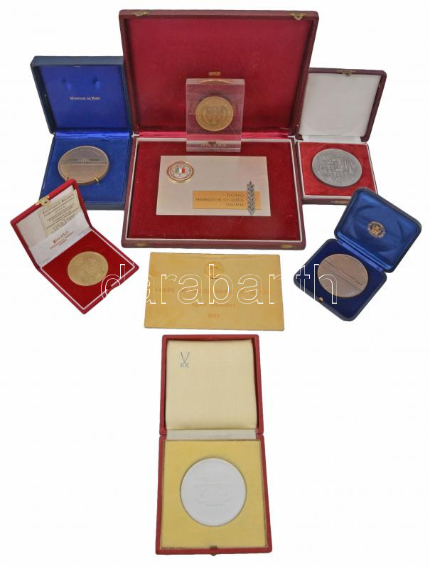 Description: 8db-os vegyes külföldi emlékérem, plakett tétel, közte NDK 1967. "Wartburg" meisseni porcelán emlékérem tokban (63,5mm) T:vegyes