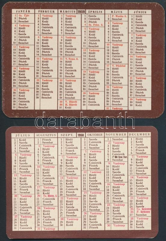 1958, 1959 Kártyanaptár benne az ünnepekkel
